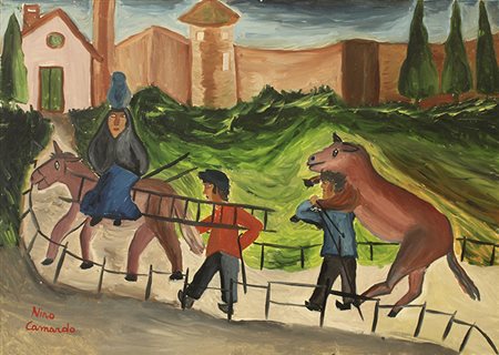 NINO CAMARDO "I mostri" anni 70', olio su tela cm 50x70 1 kg 0,50. Al verso : firma in basso a sinistra. Certificato di provenienza della Daliano Ribani Arte.