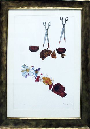MARIO SCHIFANO, "Forbici", Anni '90, Serigrafia materica su cartoncino, Dim. 70x50, Al fronte: in basso a sinistra tiratura P.A in basso a sinistra, firma in basso a destra