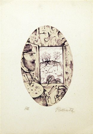 ANTONIO POSSENTI, "Pittore alla finestra", anni '80, litografia su cartoncino, cm 25x17,5. Al fronte: tiratura in basso a sinistra, esemplare PA e firma in basso a destra. Presenta leggera fioritura. Opera senza cornice.