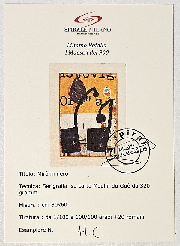 Mimmo Rotella “Mirò in Nero”, Serigrafia polimaterica su carta Moulin du Guè da 320 grammi, cm 60x80 .Esemplare in asta: H.C,Opera numerata in basso a sinistra, Opera firmata in basso a destra. La Stampa è stata realizzata da Alberto Serighelli, Arte 3, Milano nel settembre 2000. L'opera è nelle condizioni originali, e mai stata incorniciata. L'opera è accompagnata da certificato di autenticità della galleria "La Spirale" di Milano