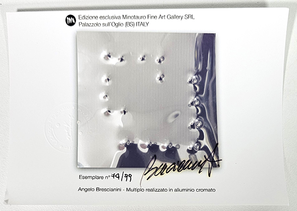 Angelo BRESCIANINI "Senza Titolo Multiplo realizzato in alluminio cromato, cm 16x16. Tiratura realizzata in 99 esemplari. Esemplare Numero 74 di 99. Firma incisa mano dall'artista in basso a destra. Numerazione incisa in basso a sinistra . Edizione realizzata in esclusiva per la Minotauro Fine Art srl di Palazzolo sull'Oglio(BS). Autentica dell'artista su fotografia