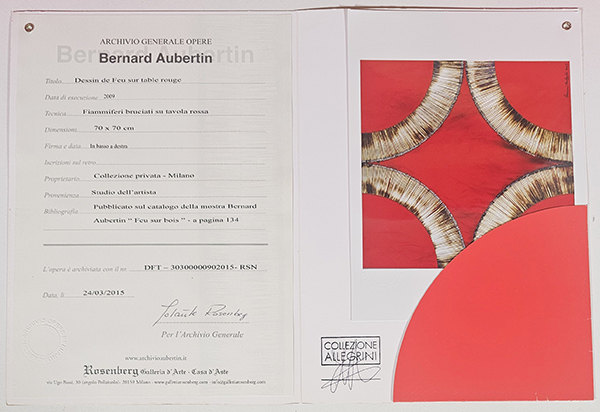 Bernard Aubertin, "Dessin de Feu sur Table Rouge" Acrilico e fiammiferi bruciati su tavola, Cm 70x70 Anno 2009 Firma e anno in basso a destra. Opera registrata presso Archivio Generale opere Bernard Aubertin al numero DFT - 30300000902015 - RSN.Certificato di autenticità e archiviazione su fotografia.. L'opera è stata esposta in occasione della mostra "Bernard Aubertin - Feu sur Bois" tenutasi presso la Galleria Rosenberg di Milano con la presenza dell'artista. Opera pubblicata nel catalogo "Feu sur Bois" a pagina 134, che verrà consegnato unitamente all'opera. Provenienza Galleria Rosenberg Milano. Timbro "Collezione Allegrini" sul certificato di archiviazione e autenticità. Opera in buone condizioni NON incorniciata