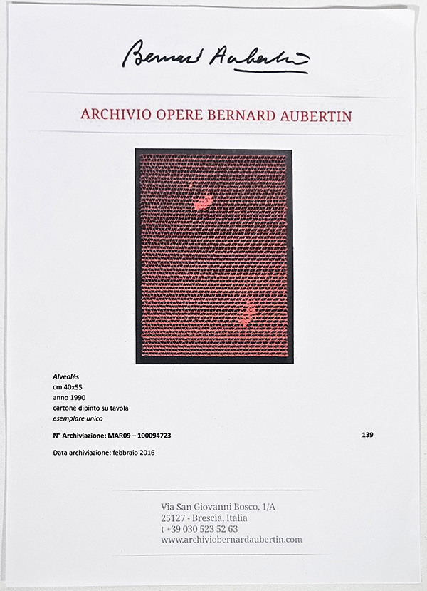 Bernard Aubertin, "Alveolés, cm 40x55 - anno 1990, cartone dipinto su tavola, Opera registrata presso "Archivio Opere Bernard Aubertin" al numero MAR09-100094723, Certificato di autenticità e archiviazione su foglio A4 , Immagine dell'artista con il retro, dell'opera inclusa. Opera Incorniciata: la cornice presenta segni di usura