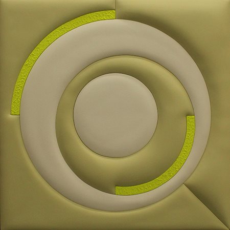 SAMUELE VENTANNI, "Introiezione: bianco e giallo circle", anni 2000, tecnica mista su tela estroflessa, 80x80x4 cm, 4,20 kg. Al verso: titolo in alto a sinistra, firma e timbro centrali, misure in basso a destra. Certificato di provenienza della Daliano Ribani Arte. Opera senza cornice.