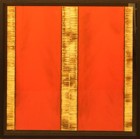 BERNARD AUBERTIN, "Dessin de Feu sur table rouge", 2007, fiammiferi bruciati su tavola rossa, 70x70 cm, con cornice 78x78x3 cm, peso 7,60 kg, archivio generale opere Bernard Aubertin al N°DFT-30100000702015-RSN in data 24/03/2015. Pubblicato sul catalogo della mostra Bernard Aubertin "Feu sur bois" a pag 133. Al verso: firma e anno in basso al centro. Opera con cornice.
