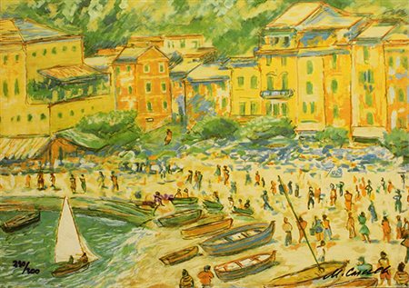 MICHELE CASCELLA "Portofino vivace", anno 1984, serigrafia e litografia a 34 passaggi di colore, tiratura 300 esemplari in numeri arabi +C numeri romani e alcune prove d'autore. Tiratura 290/300. Opera senza cornice