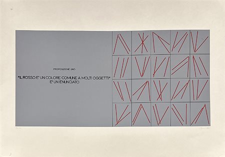 ANNA LEVI, "Proposizione 1 Il rosso è un colore comune a tanti oggetti, è un enunciato", litografia su cartoncino, cm 50x70x0,5, kg 0,5. Al fronte: tiratura 97/100 in basso a sinistra, firma in basso a destra. Al verso: firma. Opera senza cornice