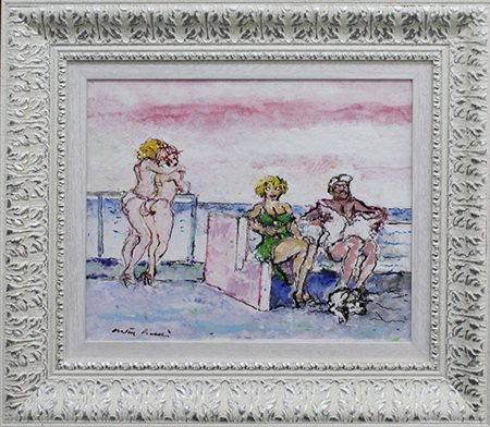 WALTER PIACESI, "Siesta sul lungomare", 2019, Tecnica mista su cartoncino, Dim. 31x38,4, Al fronte: firma in basso a sinistra, Al verso: anno, firma, titolo, tecnica, dimensione