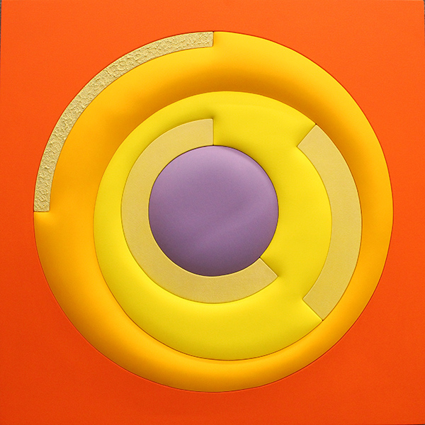 SAMUELE VENTANNI, "Introiezione: tre gialli circle", anni 2000, tecnica mista su tela estroflessa, 80x80x3 cm, 4,45 kg. Al verso: titolo in alto a sinistra, firma e timbro centrali, misure in basso a destra. Certificato di provenienza della Daliano Ribani Arte. Opera senza cornice.