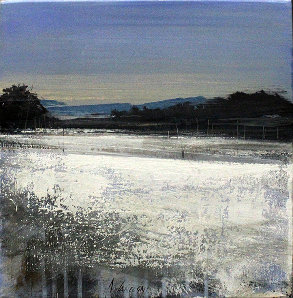AGOSTINO CANCOGNI, "Inverno", 2018, olio su tavola, 30x30. Al fronte: firma in basso al centro, al verso: firma e titolo in basso al centro; timbro "Raccolta Grandi Maestri" con dettagli in basso a destra: nome autore, tecnica, dimensioni, titolo. anno, autentica su foto dell'artista