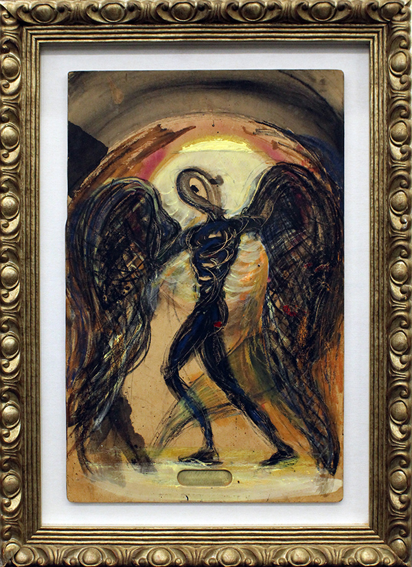BRUNO CECCOBELLI , "Angelo negro ", anni 2000 circa, tecnica mista su tavola, cm 78x49.5 con cornice 101x73x5.5 kg . Al verso: titolo e firma. Opera con autentica e certificato di provenienza della galleria Daliano Ribani Arte. Opera con cornice in omaggio.