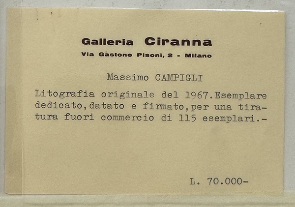 CAMPIGLI MASSIMO, 1967, litografia su carta, cm 50x68, esemplare dedicato ad personam, non numerato
