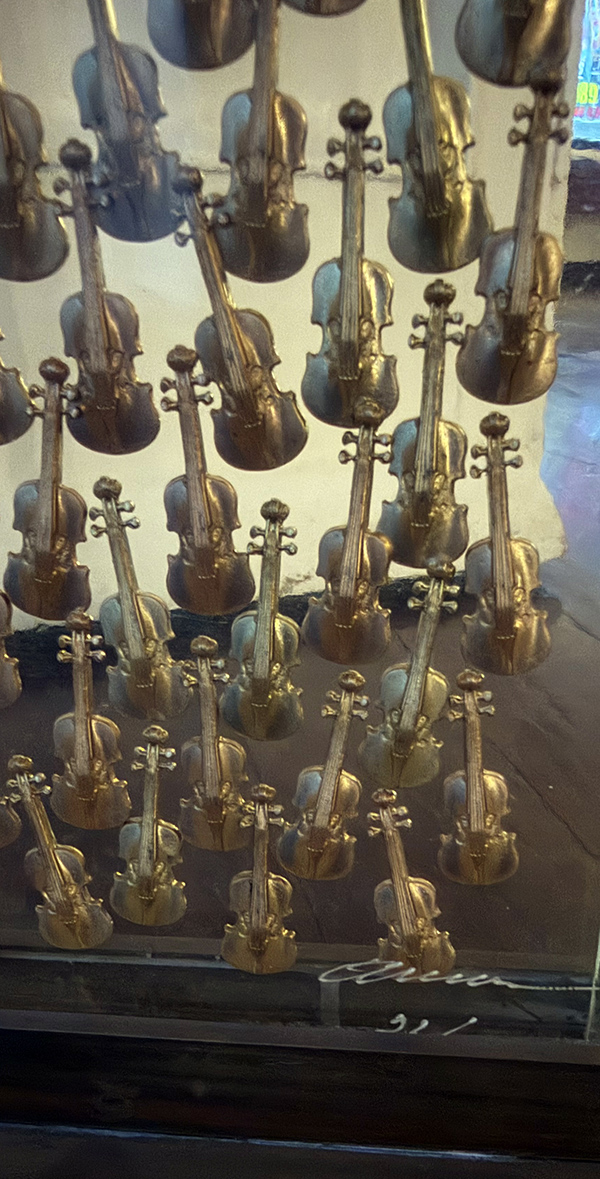FERNANDEZ ARMAN, "Violini", scultura in resina: inclusione di violini, cm 27x15. Opera con piedistallo. Opera eseguita in 99 esemplari