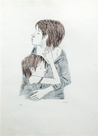 XAVIER BUENO, "Abbraccio", anni '80, litografia su cartoncino, cm 50x70. Tiratura in basso a sinistra, Firma in basso a destra, Esemplare 46/125. Opera senza cornice.