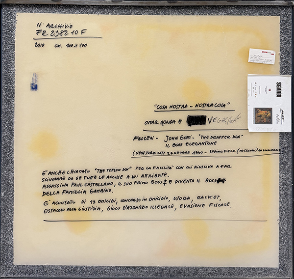 OMAR RONDA, "John Gotti, star frozen", 2010, foto con polimero termoplastico, cm 100x100. Al verso: firma, anno, titolo, misure, descrizione da parte dell'autore, numero di archivio, etichetta Fondazione Sgarbi. Opera accompagnata da certificato di provenienza