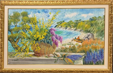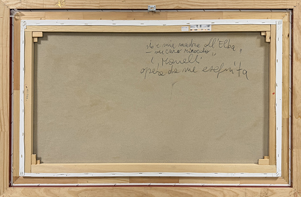 LUCIANA MANELLI, "Io e mia madre all'Elba", olio su tela, cm 60x100. Al fronte: firma in basso a sinistra. Al verso: titolo, firma e dichiarazione di autenticità da parte dell'artista. Opera accompagnata da certificato di provenienza. Opera con cornice.
