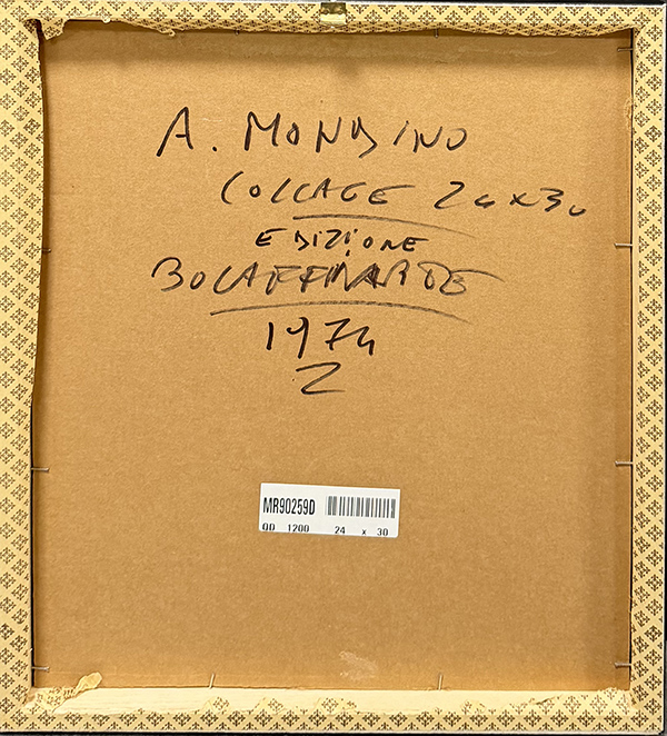 ALDO MONDINO, "Collage", 1974, tecnica mista e collage su cartoncino, cm 30x24. Al fronte: timbro Bolaffarte in basso a sinistra. Al verso: firma, anno, tecnica, misure. Opera accompagnata da certificato di provenienza. Opera con cornice.