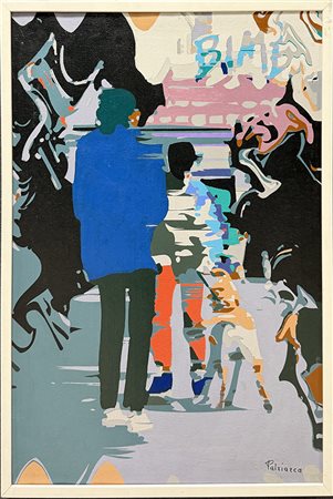 AMATO PATRIARCA, "Piazza", olio su carta, cm 80x60. Al fronte: firma in basso a destra. Al verso: titolo, misure, pag. 35 di pubblicazione. Opera accompagnata da certificato di provenienza. Opera con cornice.