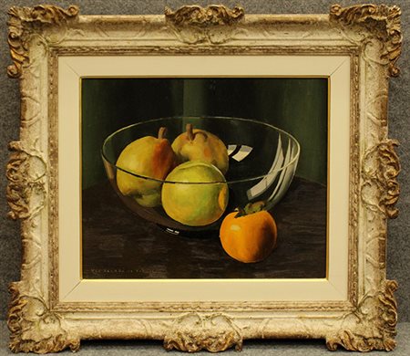 UGO CELADA DA VIRGILIO, "Natura morta", anni '50 circa, olio su tavola, 34x41 cm, con cornice 54x62x7,5 cm, 3,30 kg. Opera archiviata dall'Archivio Ugo Celada da Virgilio a cura dello Studio d'Arte Mutinense in data 17/09/2021, Modena al N°M17.092021043. Al fronte: firma in basso a sinistra. Certificato di provenienza della Daliano Ribani Arte. Opera con cornice in omaggio.