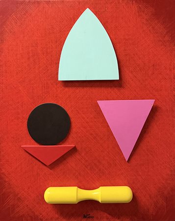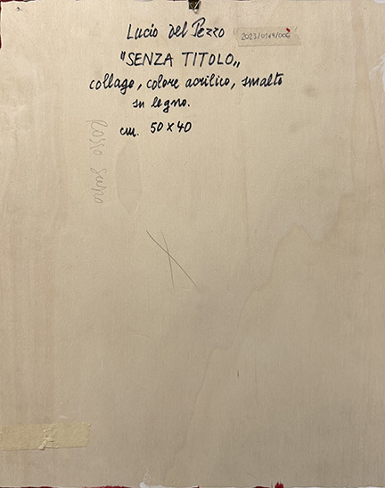LUCIO DEL PEZZO, Senza titolo, collage, colore acrilico e smalto su legno, cm 50x40. Al fronte: firma in basso al centro. Al verso: firma, tecnica, dimensioni. Opera accompagnata da certificato di provenienza. Opera senza cornice.