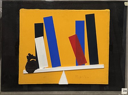 ALDO MONDINO, "Bilancia", anni '70, collage e tecnica mista su tela, cm 40x50. Al fronte: firma in basso a destra. Bibliografia: "Aldo Mondino, Catalogo generale vol. 1", Archivio Aldo Mondino, Allemandi, Torino 2017, p. 137. Opera accompagnata da certificato di provenienza. Opera conservata in teca di plexiglass.