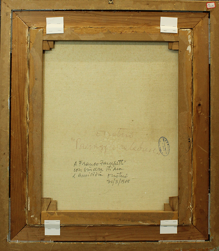 ENOTRIO PUGLIESE, "Paesaggio Calabrese", 1968, olio su tela, 50x60 cm, con cornice 78x68x4 cm, peso 5 kg. Al fronte: firma in basso a destra. Al verso: firma, titolo, dedica, anno, timbro. Opera con cornice.