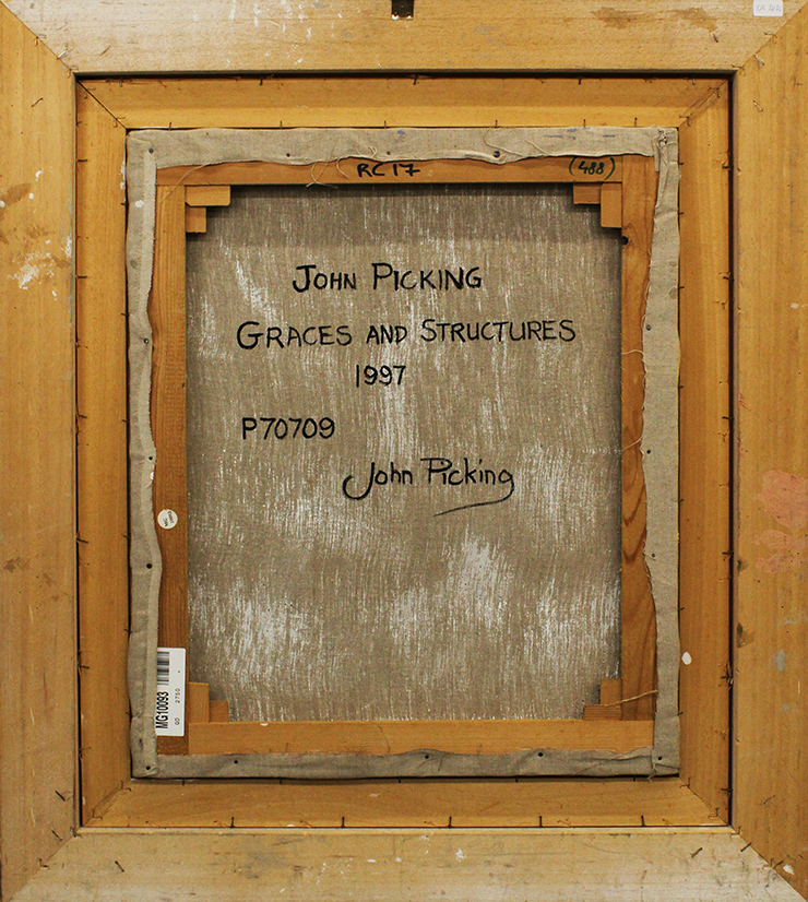 JOHN PICKING, "Graces and Structures", 1997, olio su tela, dim 60x50. Al verso: nome autore, titolo, anno, numero P70709, firma al centro. Opera con cornice.