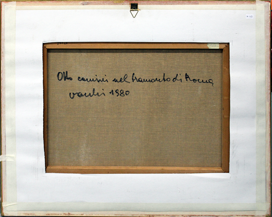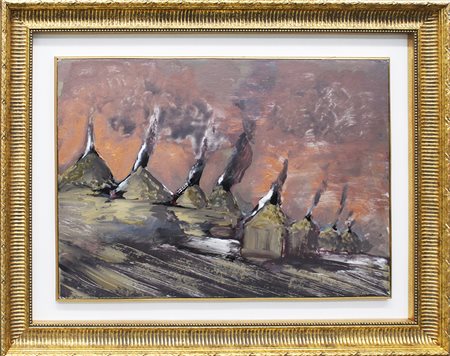 SERGIO VACCHI, "Otto camini nel tramonto di Roma", 1980, olio su tela, dim 50x70 cm. Al verso: titolo, firma, anno in alto al centro. Opera con cornice.