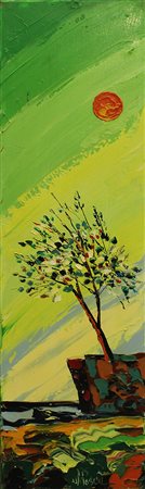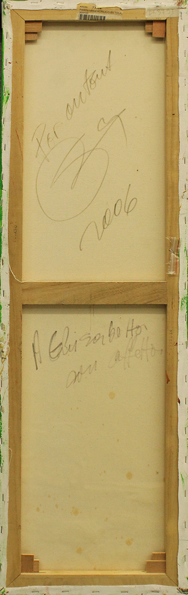 NELU PASCU, 2006, olio su tela, 100x30x1 cm, peso 1,30 kg. Al fronte: firma in basso al centro. Al verso: etichetta con informazioni, anno, firma, dedica, dichiarazione di autenticità da parte dell'artista. Autentica su foto dell'artista. Opera con certificato di provenienza della Daliano Ribani Arte. Opera senza cornice.