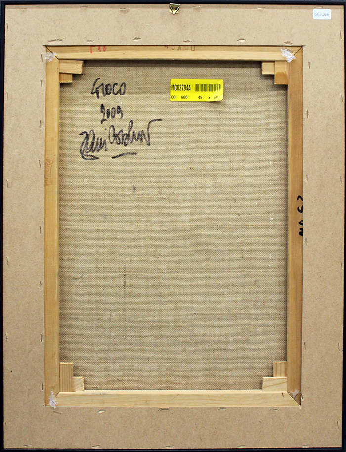 CORRADO ZANI, "Gioco", 2009, tecnica mista su tela, dim 45x60, opera archiviata a cura dell'artista al N°F18-MO 52 . Al fronte: firma in basso a destra. Al verso: titolo, anno, firma in alto a sinistra. Opera con cornice.