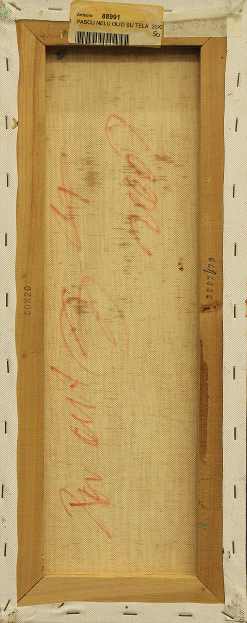 NELU PASCU, 2008, olio su tela, 50x20x1 cm, peso 0,40 kg. Al fronte: firma al centro a sinistra. Al verso: firma, anno, dichiarazione di autenticità da parte dell'artista. Autentica su foto dell'artista. Opera con certificato di provenienza della Daliano Ribani Arte. Opera senza cornice.