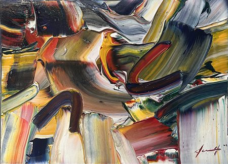 PIERLUIGI DE LUTTI, Senza titolo, anni 2000, olio su cartone telato, cm 50x70, peso 0,5 kg. Opera archiviata dall'Archivio Pierluigi De Lutti . Al fronte: firma in basso a destra. Al verso: firma, dimensioni, "senza titolo". Opera con certificato di provenienza della Daliano Ribani Arte. Opera senza cornice.