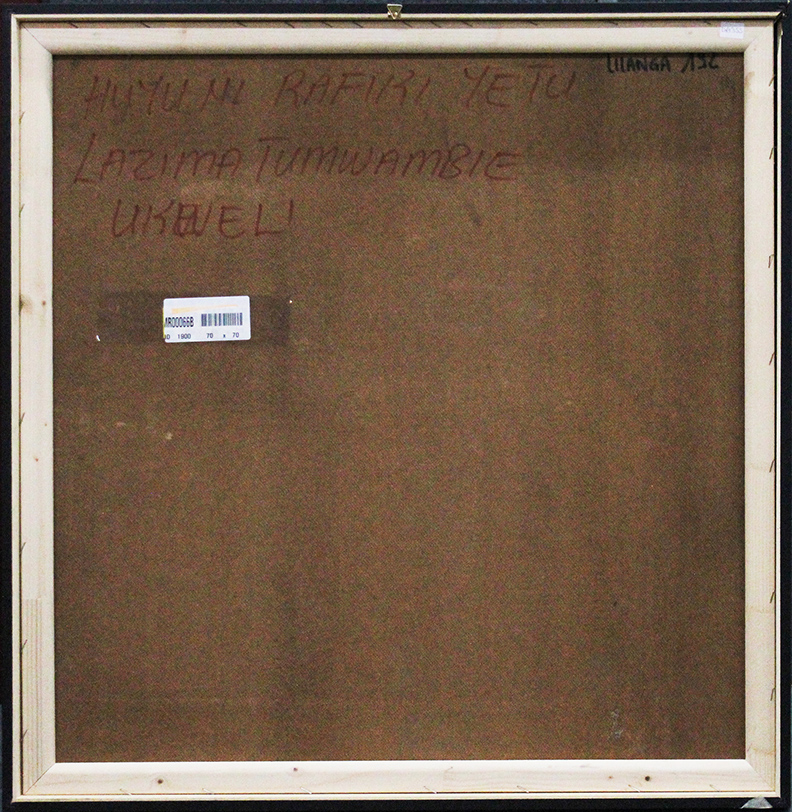 LILANGA, "Huyuni rafiki yetu lazima tumwambie ukweli" (Questo è il nostro amico, dobbiamo dirgli la verità), Anni 2000, Acrilico su faesite, Dim. 70x70. Al verso: titolo e firma. Al fronte: firma in basso a sinistra