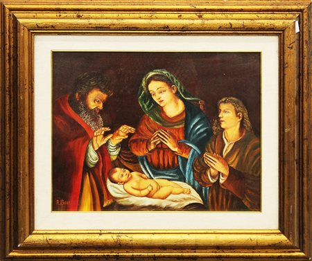 ANTERO BINI, "Adorazione dei Magi", anni '70, olio su tela, dim 39x48. Al fronte: firma in basso a sinistra. Al verso: in alto a sinistra titolo, nel centro nome artista e al centro timbro dell'artista. Opera con cornice.